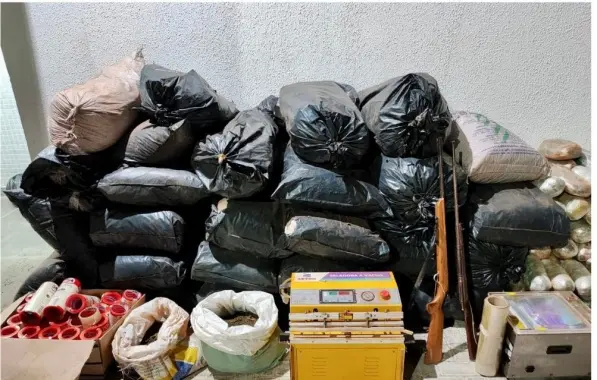 Os agentes encontraram os 634 kg de maconha, como também uma prensa manual, duas seladoras a vácuo, embalagens plásticas e duas espingardas.