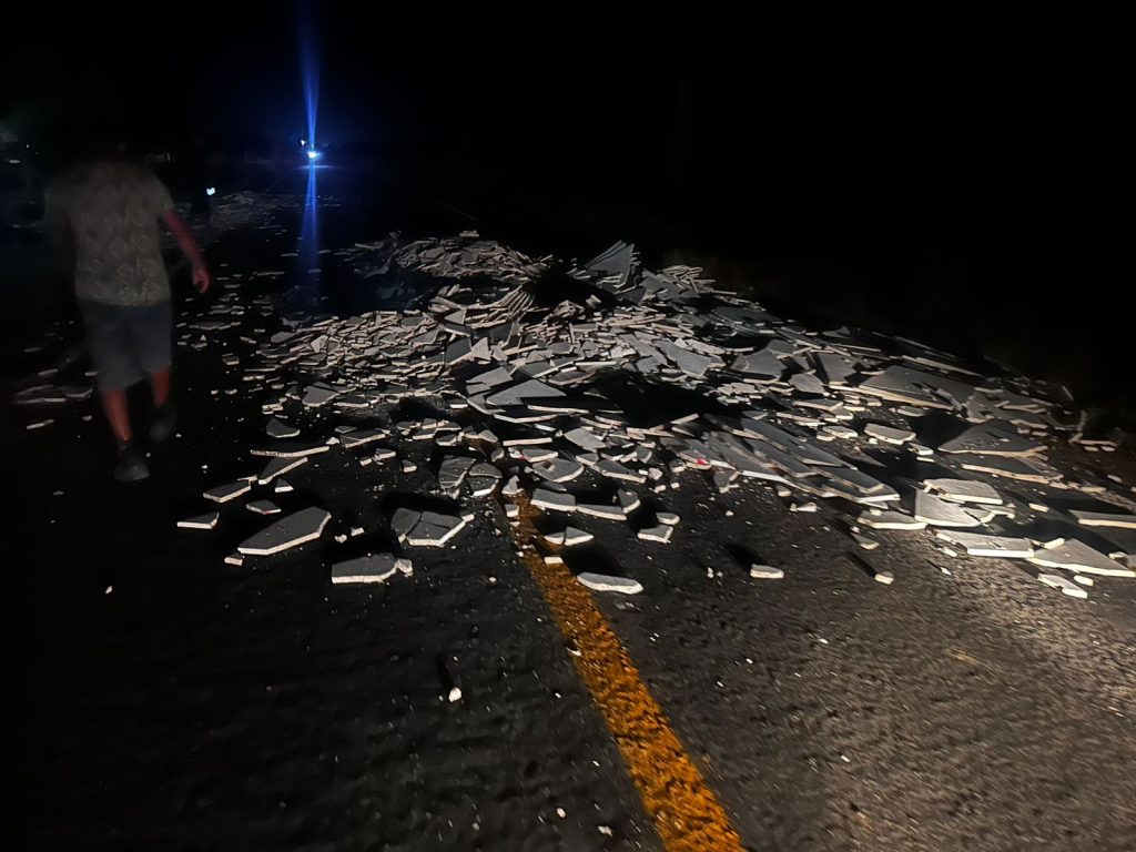 Na noite desta terça-feira, um incidente foi registrado na estrada de Ourolândia, em um trecho conhecido como “Zé da Muda”. Um carregamento de materiais, aparentemente placas de gesso ou cerâmica, caiu na pista, cobrindo uma grande área da rodovia.