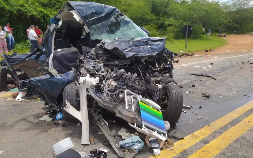 O impacto da batida foi tão forte que o carro de passeio ficou destruído. Além disso, destroços e objetos dos passageiros ficaram espalhados pelo chão.