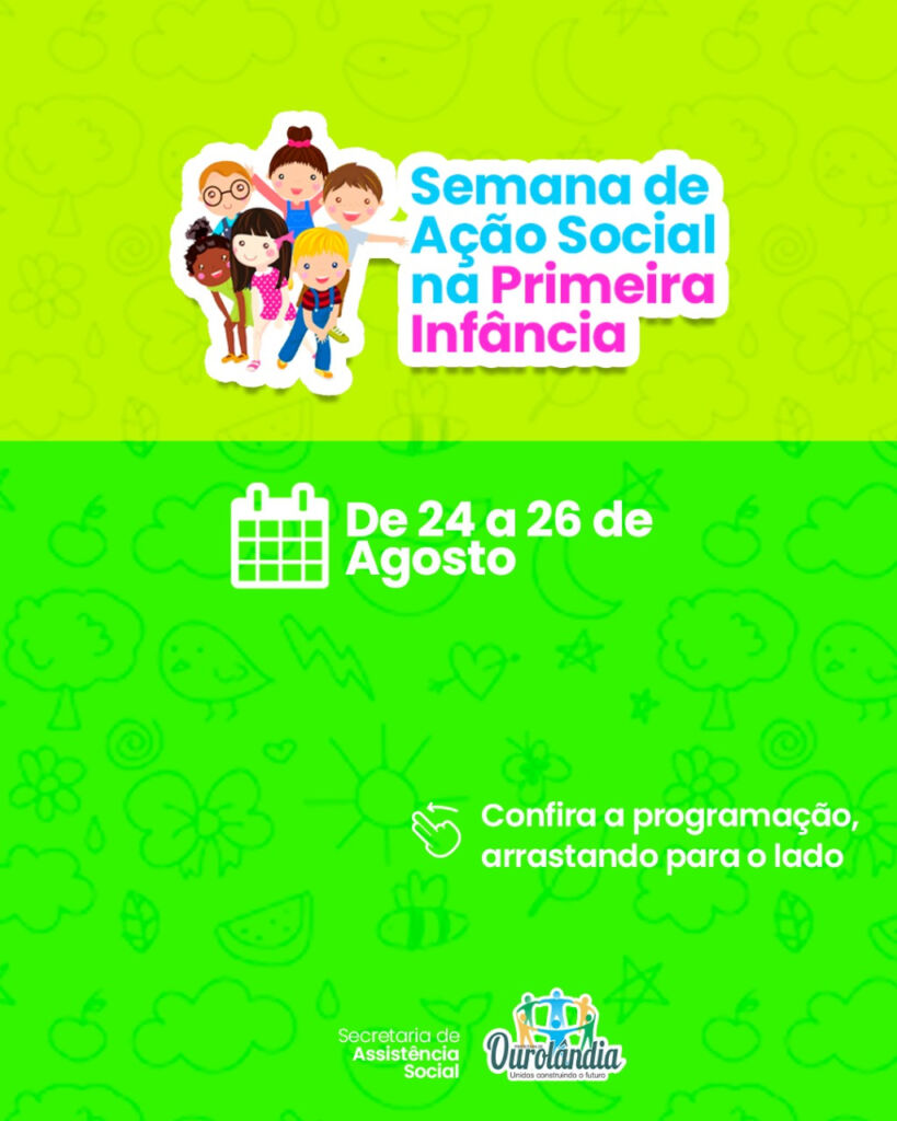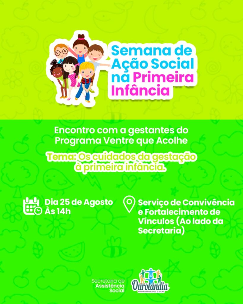 A Semana de Ação Social na Primeira Infância acontece em Ourolândia nos próximos dias 24 a 28 de agosto. A programação do evento inclui palestras e atividades voltadas para mães, gestantes e crianças do município.