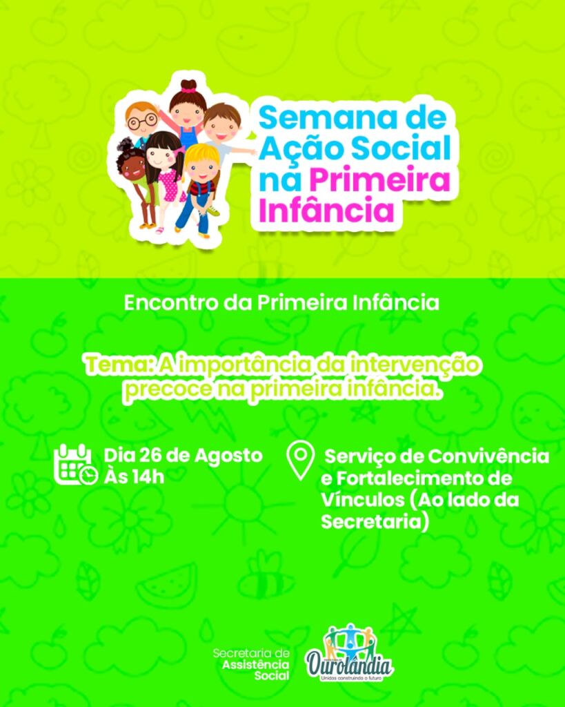 A programação segue com o Encontro da Primeira Infância no dia 26 de agosto, sexta-feira, para tratar do tema “A importância da intervenção precoce na primeira infância”. Este encontro também acontecerá no Serviço de Convivência e Fortalecimento de Vínculos, na sede do município.
