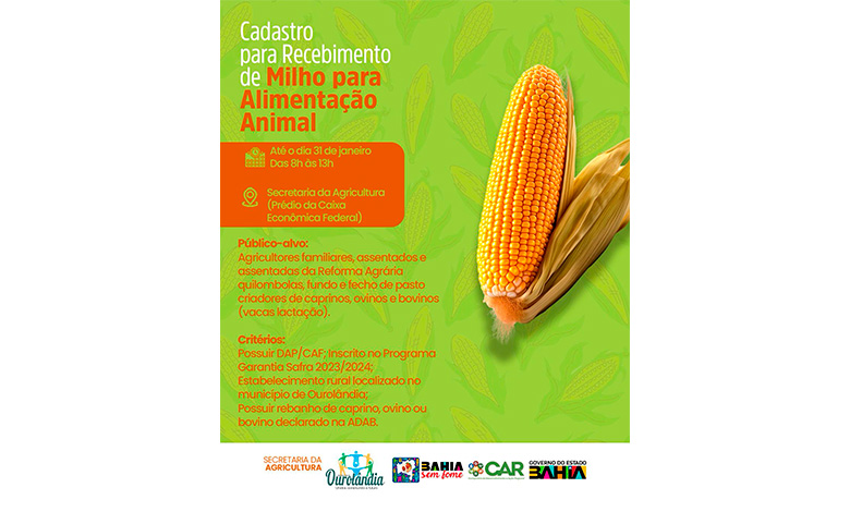 Nessa quarta-feira (17), a prefeitura de Ourolândia divulgou através do Instagram, que o cadastro para o recebimento gratuito de milho para alimentação animal está disponível e irá acontecer até o dia 31 desse mês.