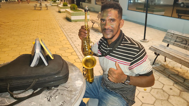 Noite de quarta-feira, 17 de janeiro de 2024, e aqui no Sambódromo da Praça Castro Alves em Jacobina, clicamos o Luiz Felipe, 33 anos, tocando louvores com o seu sax alto.