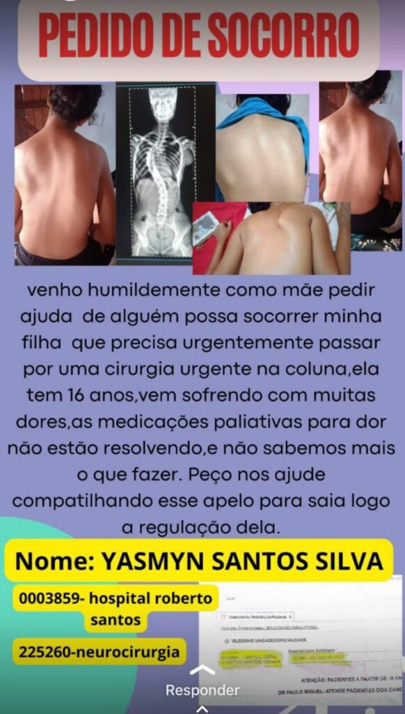 Você também pode ajudar a jovem de 16 anos, Yasmyn Santos Silva, em seu pedido de socorro, a mesma precisa urgentemente passar por uma cirurgia na coluna. Yasmyn vem sofrendo com muitas dores em decorrência de uma má formação óssea em sua coluna, as medicações estão sendo apenas paliativas, pois já não resolvem mais o problema. A jovem reside no município de Ourolândia-Ba onde é bastante conhecida, pois estuda no colégio estadual do município, sua mãe Tânia Márcia, técnica de enfermagem, também é bastante conhecida na cidade.Todos pedimos uma ajuda, seja contribuindo ou compartilhando nessa história para que uma melhor qualidade de vida seja dada para Yasmyn.Fonte: TV sertão livre