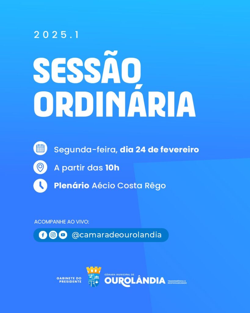 A Câmara Municipal de Ourolândia realizará, nesta segunda-feira, dia 24 de fevereiro, mais uma Sessão Ordinária, reafirmando o compromisso com a transparência e a participação popular. O encontro acontece no Plenário Aécio Costa Rêgo e contará com a presença dos vereadores para debater e deliberar sobre importantes pautas de interesse da população.