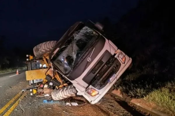 Um caminhão que transportava uma máquina motoniveladora tombou na noite desta quarta-feira (4) após se desprender de um guincho no trecho da BR-116, conhecido como Serra do Mutum, entre Jaguaquara e Jequié, no Sudoeste da Bahia.