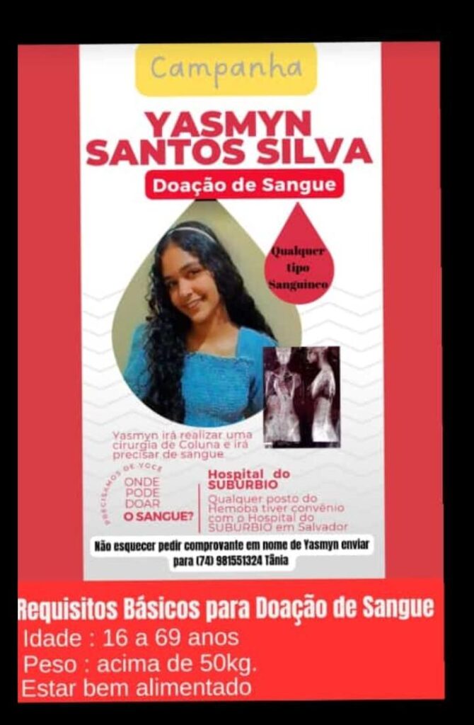 Pedimos atenção e colaboração de todos na campanha de doação de sangue para Yasmyn Santos Silva de 16 anos, a jovem reside no distrito de Alazão localizado no município de Ourolândia-Ba.
