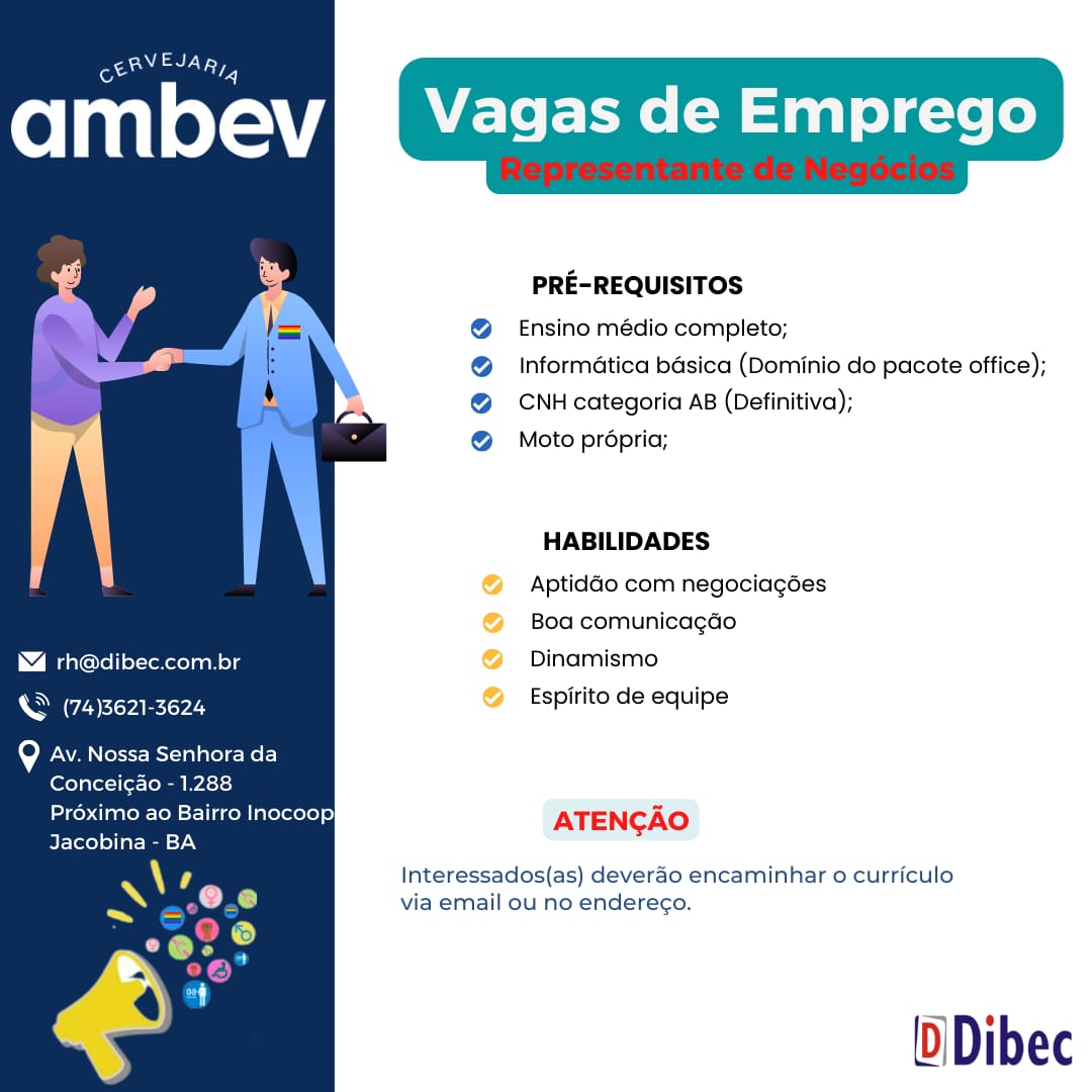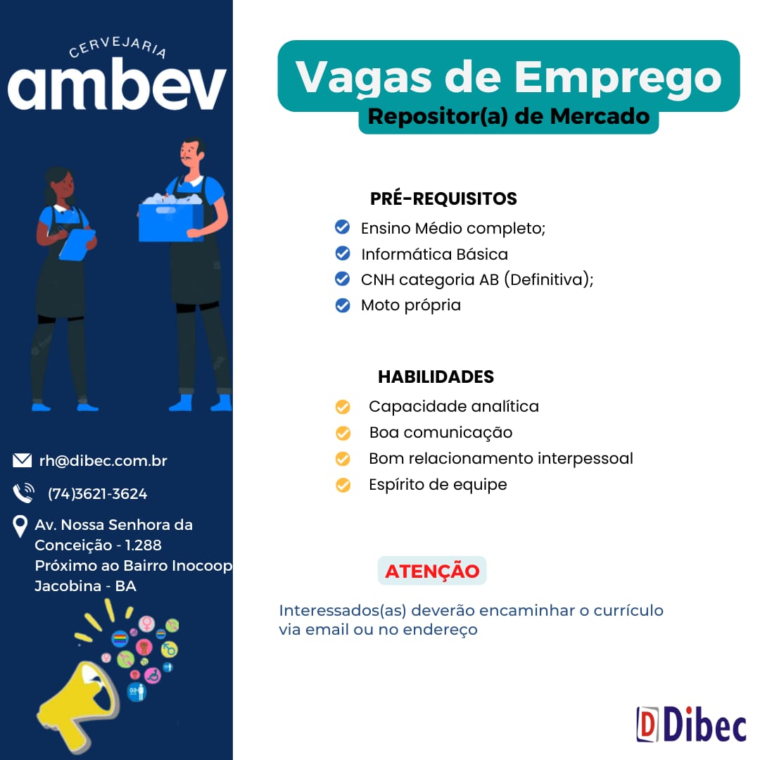A cervejaria Ambev, em Jacobina e região, está ofertando duas vagas de emprego para dois setores: repositor de mercado e representante de negócios.