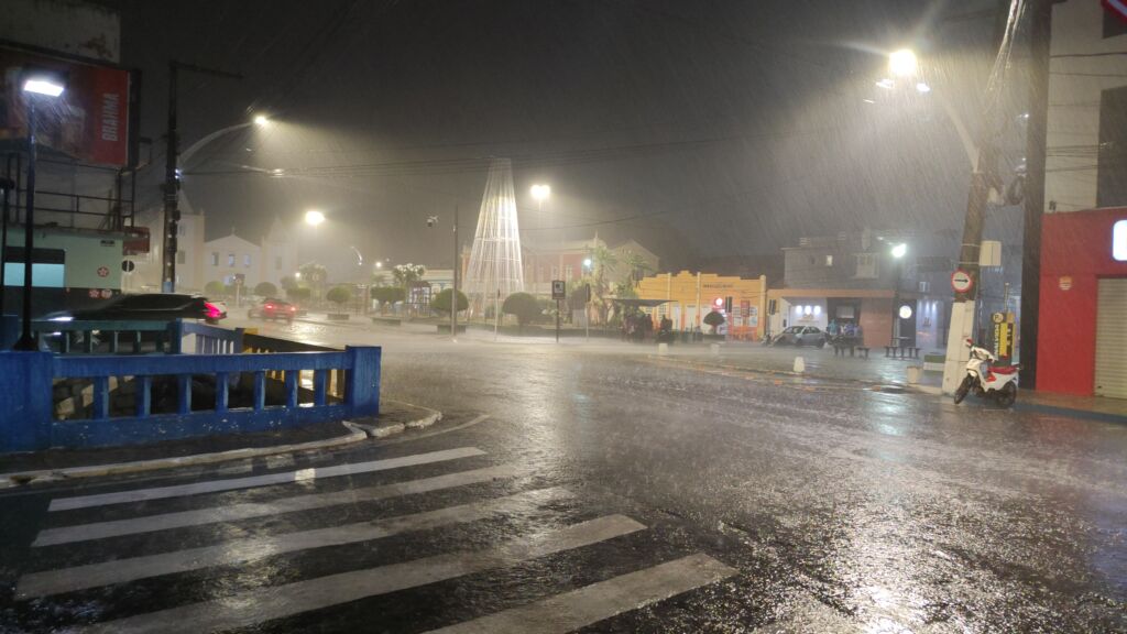 Noite de quinta-feira, 03 de novembro de 2022, e aqui observamos uma forte chuva que cai na Praça Castro Alves, na cidade de Jacobina.