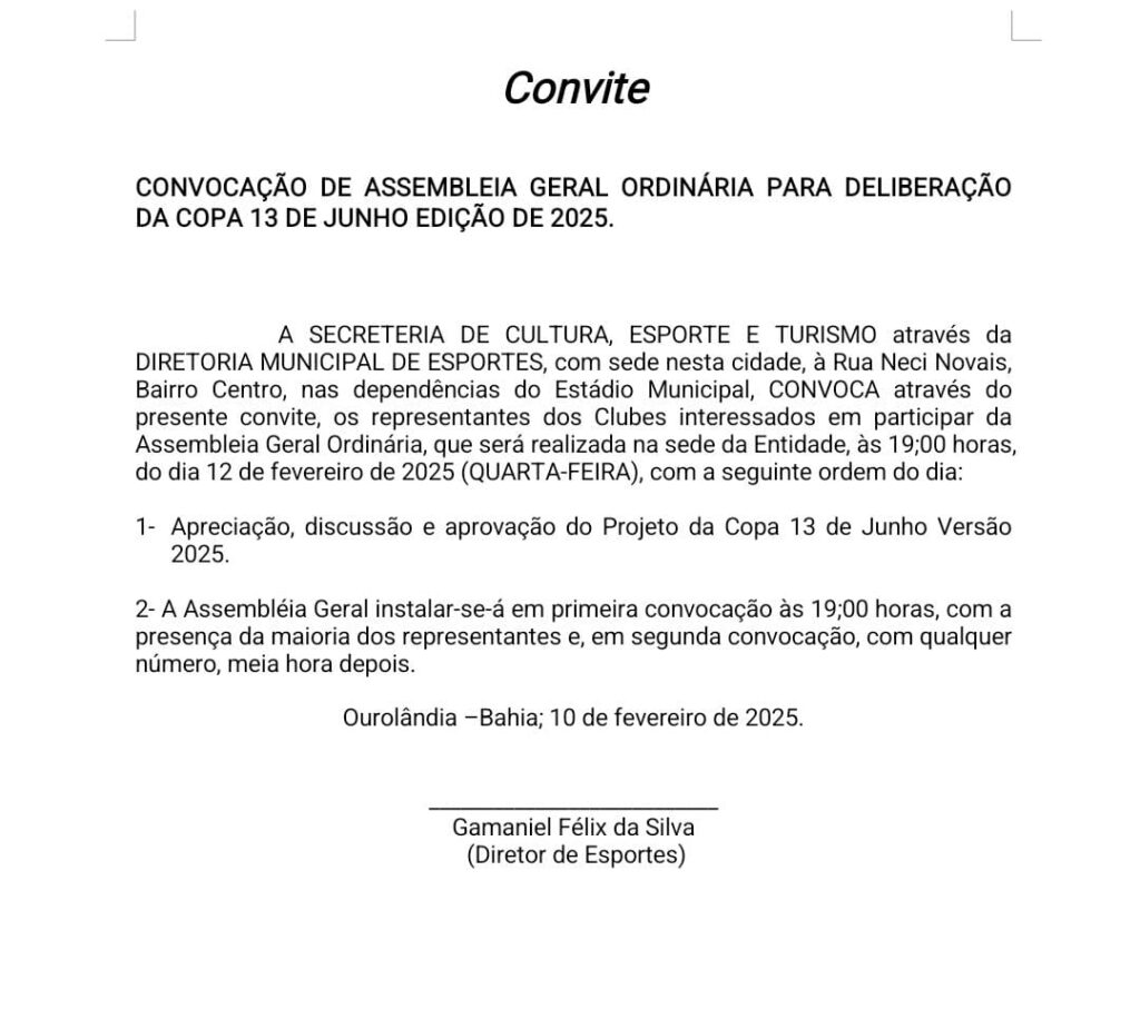 A Diretoria Municipal de Esportes de Ourolândia convida todos os representantes de clubes que desejam participar da Copa 13 de Junho – Edição 2025 para a Assembleia Geral Ordinária, que será realizada no dia 12 de fevereiro de 2025 (quarta-feira), às 19h, na sede da entidade, localizada no Estádio Municipal.
