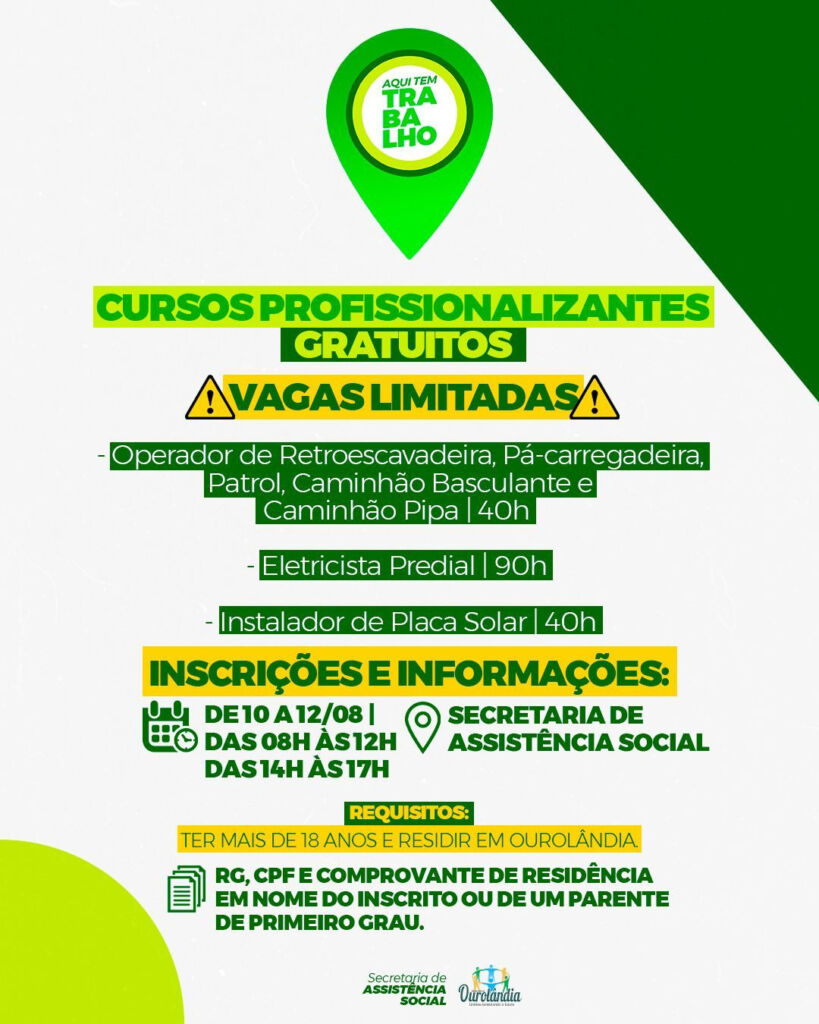 Os cursos disponíveis são para Eletricista Predial, Instalador de Placa Solar, além de Operador de Retroescavadeira, Pá-carregadeira, Patrol, Caminhão Basculante e Caminhão Pipa. “Esses cursos são uma excelente forma de capacitar mais trabalhadores e consequentemente contribuir para o crescimento pessoal de nossa gente e para o desenvolvimento de nosso município”, afirma a secretária de Assistência Social ourolandese.