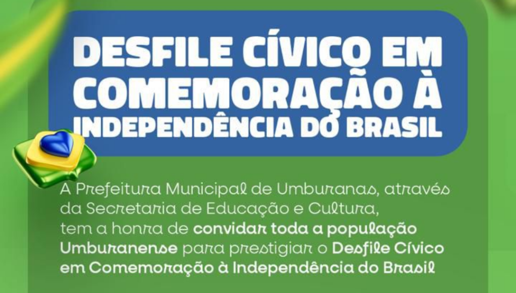 A Prefeitura Municipal de Umburanas, por meio da Secretaria de Educação e Cultura, informa que o tradicional Desfile Cívico em Comemoração à Independência do Brasil será realizado no próximo sábado, dia 06 de setembro, na Avenida Severino Ribeiro Granja, a partir das 08h da manhã.