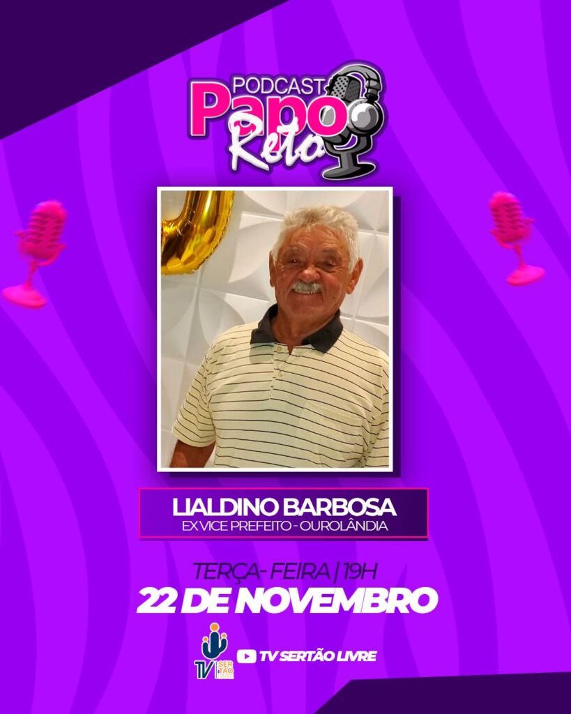 É hoje, dia 22 de novembro de 2022, fique ligado em mais um Podcast PAPO RETO, e o convidado desta terça feira, será nosso querido amigo e ex prefeito de Ourolândia o SR. LIALDINO BARBOSA.