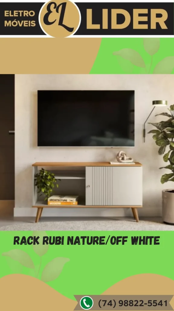 Entre os destaques está o Rack Rubi Nature/Off White, um móvel de linhas clean, com porta deslizante e nichos amplos, ideal para quem deseja um ambiente organizado e sofisticado. A combinação de cores claras com madeira natural traz leveza ao espaço.