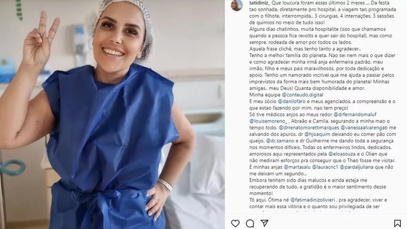 Em junho, Tatiana contou que passoy por três cirurgias, quatro internações e sessões de quimioterapia em um hospital particular de São Paulo. “Não tem sido fácil, mas quando somos cercadas de médicos que se dedicam ao nosso caso, de forma única, percebemos que temos muito mais a agradecer do que lamentar”, escreveu à época.