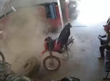 Na explosão, o homem foi arremessado e o pneu subiu que chegou a quebrar o teto do estabelecimento. Câmeras de segurança flagraram o momento do ocorrido.