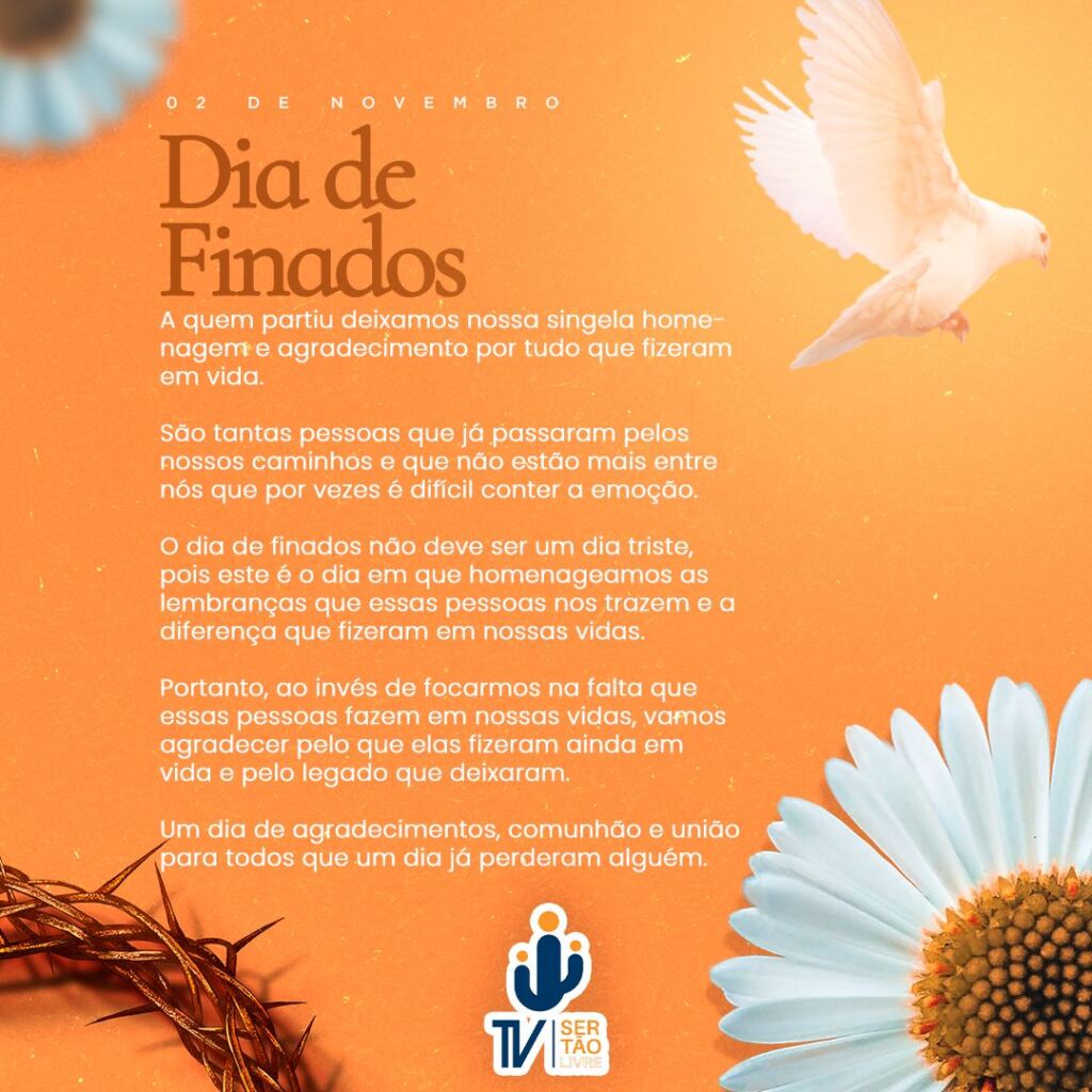 Hoje é Dia de Finados, e a Tv Sertão Livre vem por meio desta mensagem homenagear e prestigiar aos entes queridos e devemos refletir na obra do Senhor e nas pessoas que amamos, mas já não vivem mais entre nós.