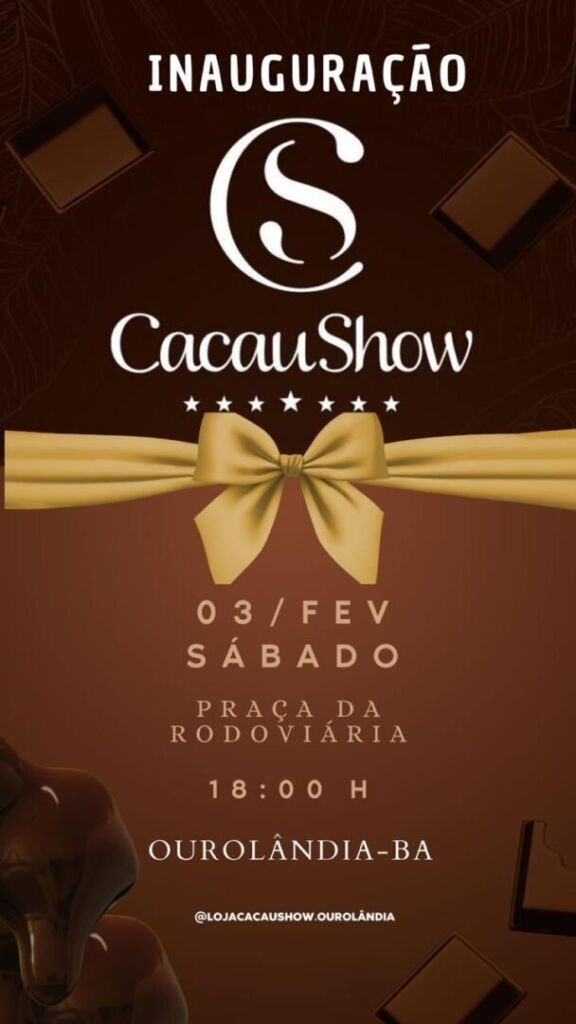 Prepare-se para adoçar seus dias com a inauguração da Cacau Show na Praça da Rodoviária em Ourolândia! No próximo sábado dia 3 de fevereiro, às 18 horas, junte-se a nós para celebrar a chegada da loja que vai conquistar seu paladar.