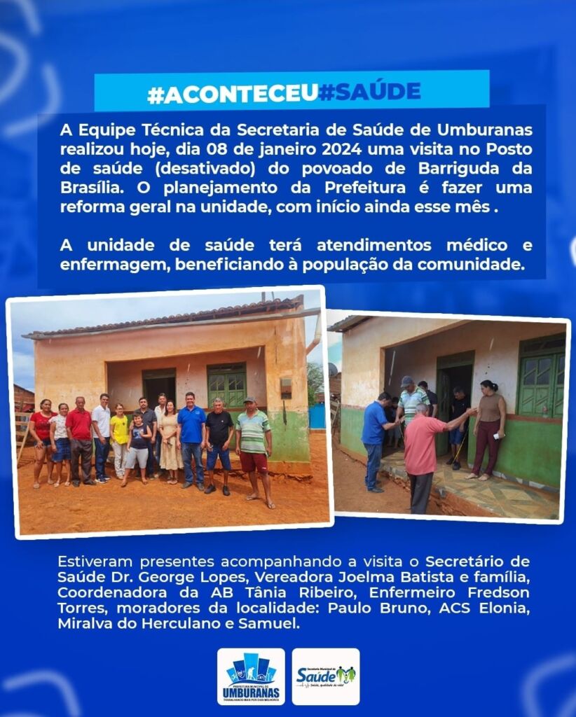 Nessa Segunda-feira (08), a prefeitura de umburanas divulgou em suas redes sociais, a visita da equipe técnica da Secretaria de Saúde de Umburanas ao prédio desativado do posto de saúde na comunidade de Barriguda da Brasília