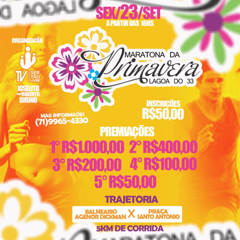 Com o percurso de aproximadamente 5 km, saindo do balneário AGENOR DICKMAN até a PRAÇA SANTO ANTÔNIO em Lagoa do 33, a maratona estará acontecendo a partir das 16 h, no dia 23 de setembro, para fazer sua inscrição entre em contato via WhatsApp pelo número (71) 9 9965 – 4330.