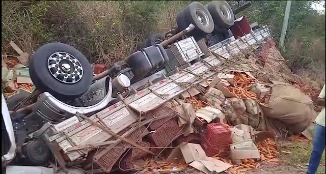 Na manhã desta terça-feira, 31 de outubro de 2023, um caminhão carregado com cenouras capotou na BA 131, na saída da cidade de Saúde, sentido Senhor do Bonfim.