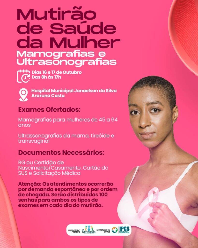 As mulheres de Ourolândia terão dois dias de cuidados especiais na próxima semana. Nos dias 16 e 17 de outubro, será promovido o Mutirão de Saúde da Mulher, com a realização de exames para o público feminino, no Hospital Municipal Janaelson da Silva Araruna Costa, das 8 às 17 horas.