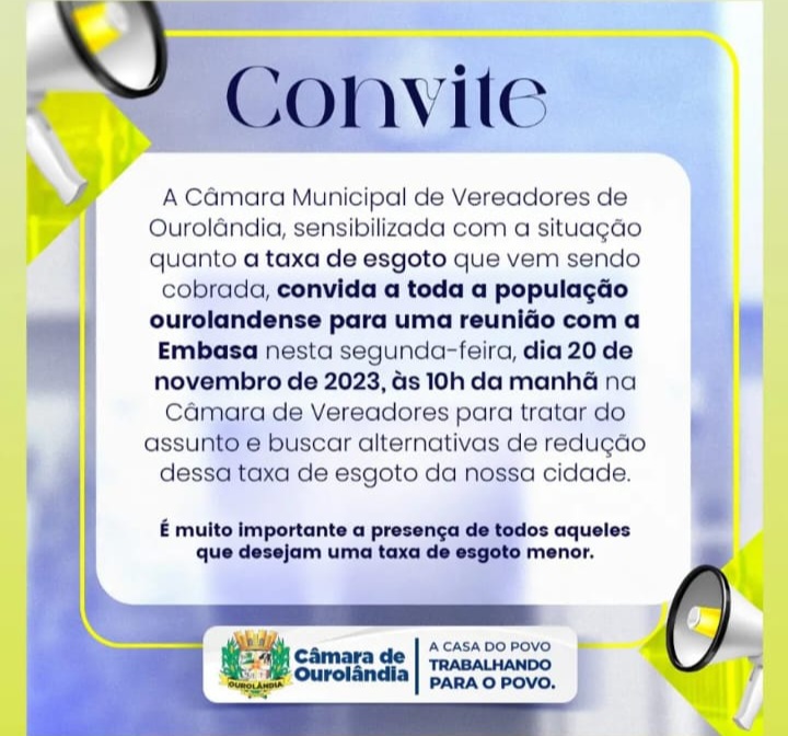 Os vereadores que compõe a Câmara Municipal está convidando a todos os cidadãos ourolandenses para uma reunião com a Embasa na próxima segunda-feira, dia 20 de novembro, a partir das 10 horas da manhã.