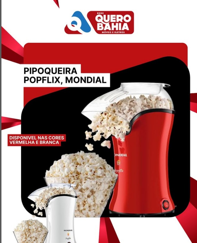 Na Quero Bahia de Ourolândia, preparamos tudo para tornar o seu arraial ainda mais especial. Apresentamos a Pipoqueira Elétrica Popflix Mondial — ideal para quem valoriza praticidade, bom gosto e o prazer de servir uma pipoca fresquinha, sem óleo e sem bagunça.