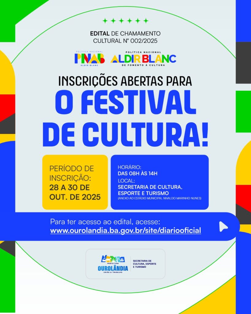 A Prefeitura de Ourolândia, por meio da Secretaria de Cultura, Esporte e Turismo, informa que estão abertas as inscrições para o Festival de Cultura, realizado através do Edital de Chamamento Cultural nº 002/2025 – PNAB Aldir Blanc.