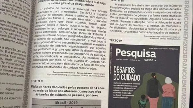 Uma foto da página de redação teria vazado às 13h30, horário em que se iniciou o primeiro dia de provas do Enem. Vale lembrar que os candidatos só são liberados a sair com o espelho das provas às 18h30. O tema da redação foi “Desafios para o enfrentamento da invisibilidade do trabalho de cuidado realizado pela mulher no Brasil”.