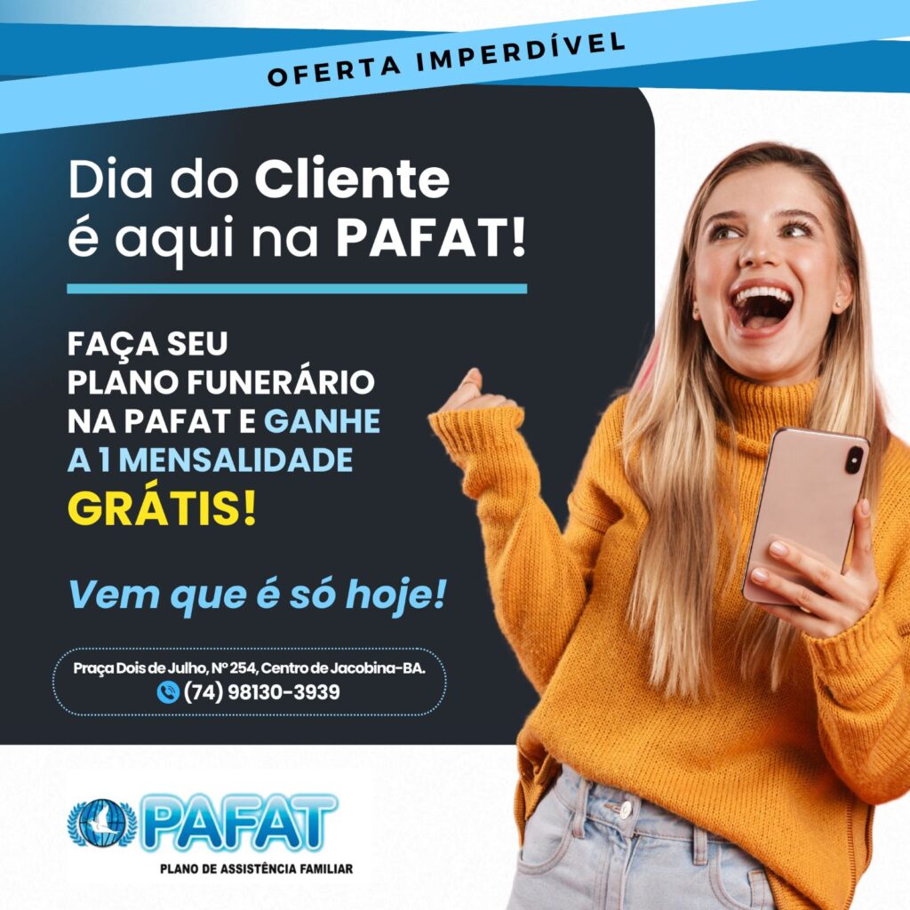Home»NOTÍCIAS»PLANO FUNERÁRIO: PAFAT  VENHAM CONFERIR A OFERTA DE HOJE DO DIA DO CLIENTE – JACOBINA E REGIÃO