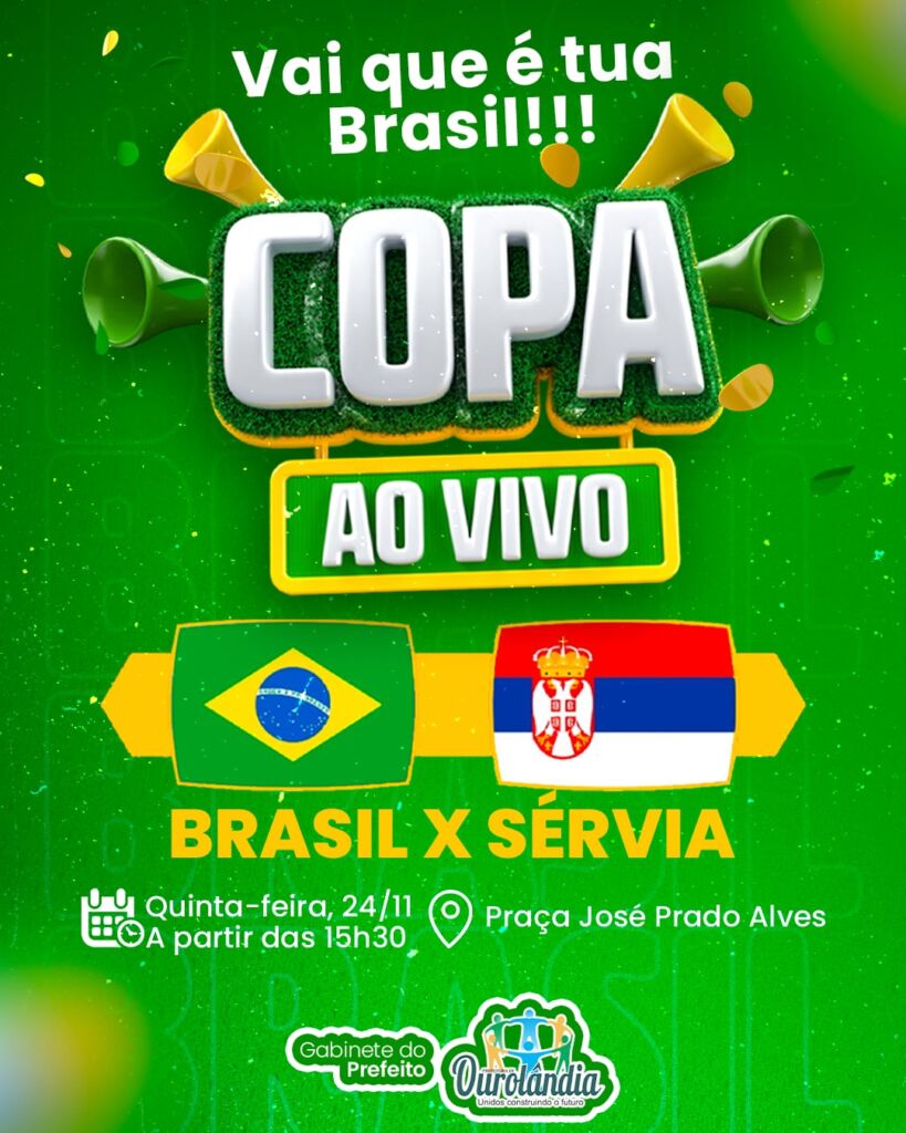 A população da cidade de Ourolândia terá a oportunidade de se concentrar para torcer pelo país em seu primeiro jogo na Copa do Mundo do Qatar 2022, nesta quinta-feira, 24 de novembro. Um telão será montado na Praça José Prado Alves e a partir das 15h30, começará a transmissão ao vivo da partida entre Brasil e Sérvia.