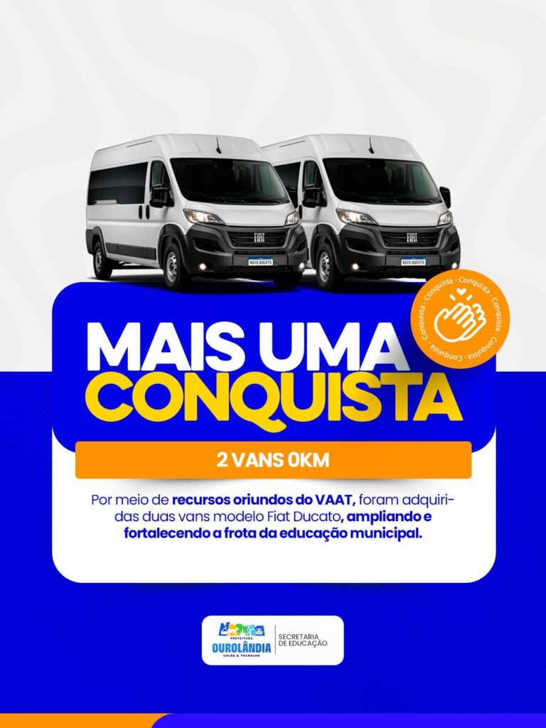 Foram entregues duas vans e um micro-ônibus escolar, adquiridos por meio de investimentos estratégicos na área da educação. As vans foram compradas com recursos próprios do município, através do VAAT (Valor Aluno Ano Total), enquanto o micro-ônibus foi viabilizado por meio de emenda parlamentar, sendo destinado ao atendimento dos alunos do Distrito de Casa Nova.