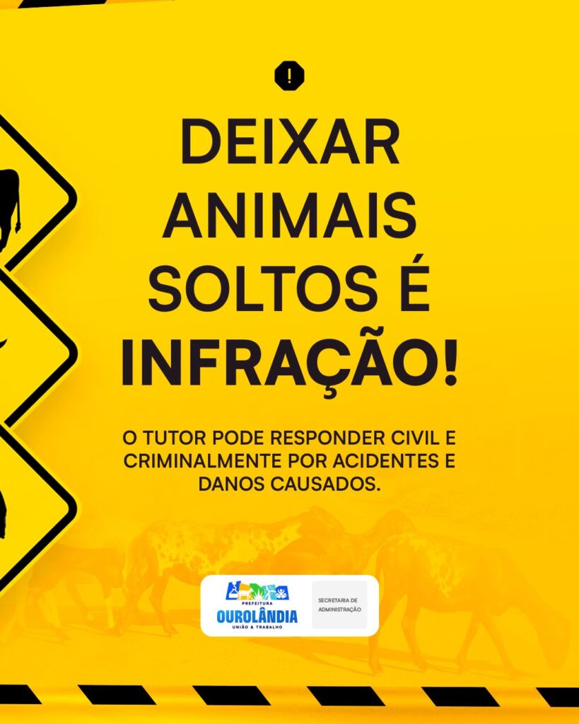 A Prefeitura de Ourolândia, por meio da Secretaria de Administração, alerta os proprietários de animais de grande porte — como cavalos, bois e vacas — sobre os riscos e responsabilidades de mantê-los soltos em vias públicas ou rodovias.