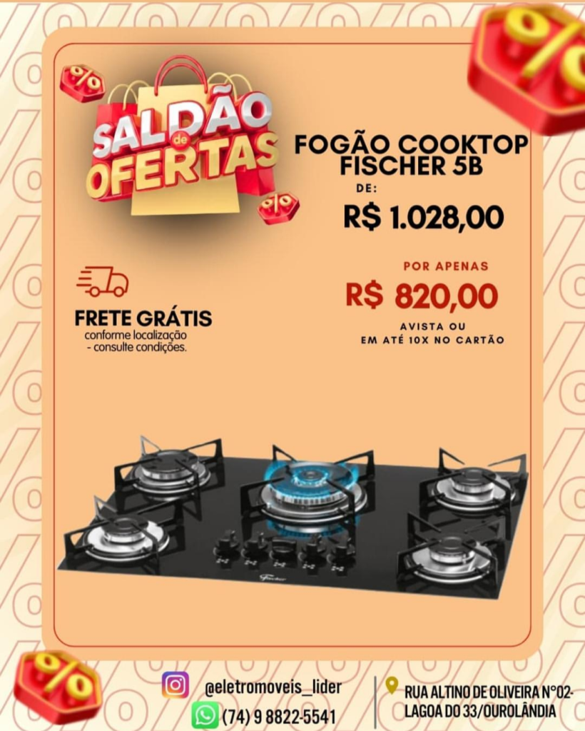 Fogão Cooktop Fischer 5B: design sofisticado, 5 bocas para cozinhar com conforto e rapidez. R$ 820,00 à vista!