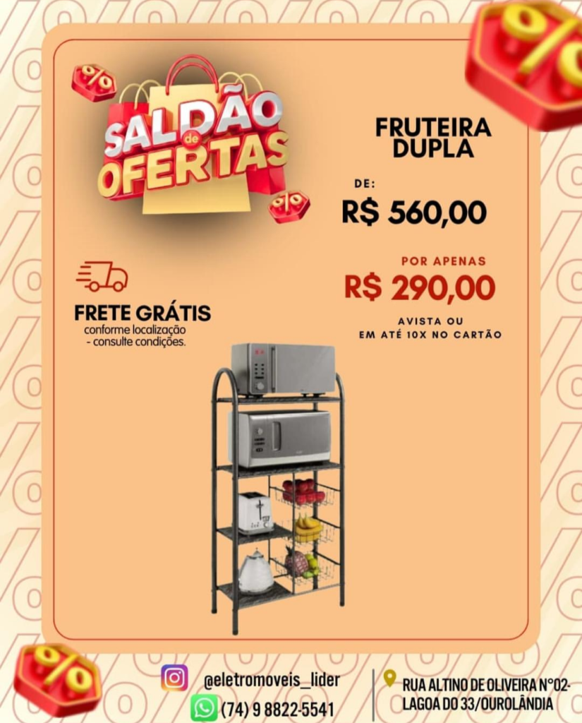 Fruteira Dupla e Fruteira Porta Micro-ondas: soluções inteligentes para organização, otimizando espaço e deixando tudo à mão. Dupla de R$ 560,00 por R$ 290,00 e Micro-ondas por R$ 225,00!