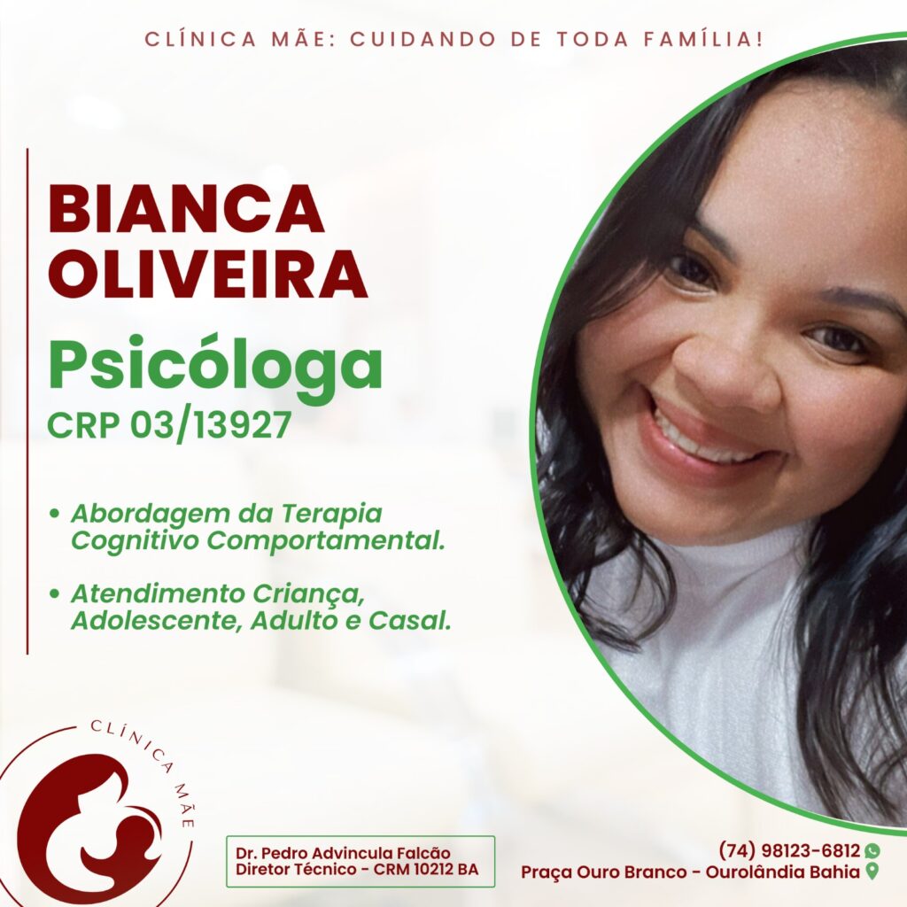 Atendimento para todos os públicos com a psicóloga Bianca Oliveira, a mesma atua na abordagem TCC (terapia cognitiva comportamental).