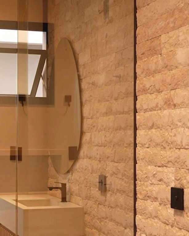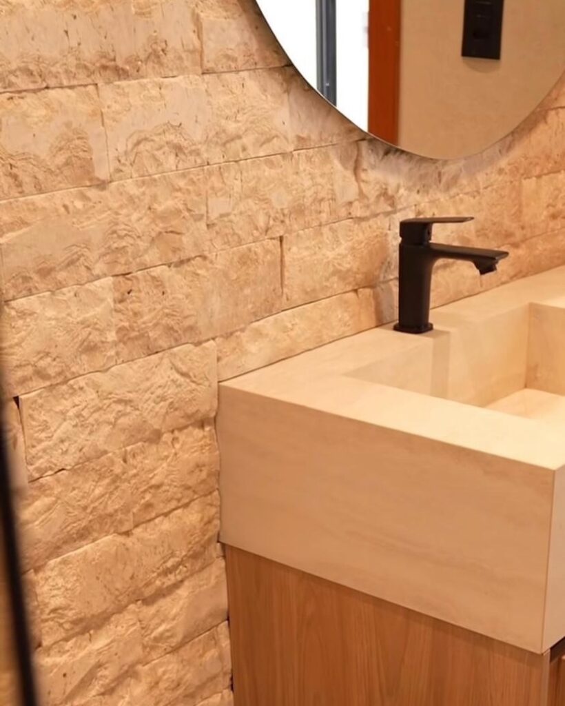 Com sua textura única e tonalidade em tons quentes de bege e areia, o Travertino Rockface é capaz de transformar qualquer ambiente — seja um banheiro, lavabo, sala de estar ou fachada. A pedra traz consigo toda a força e autenticidade da natureza, criando atmosferas aconchegantes e cheias de personalidade.