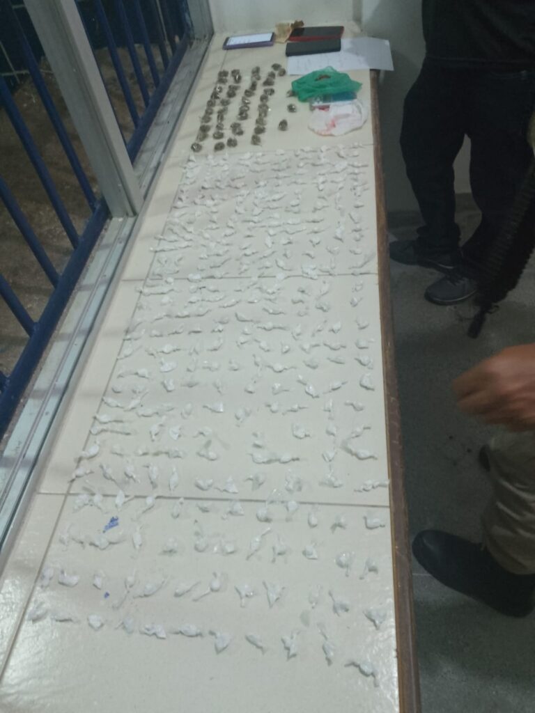 Por volta das 10h30, as equipes realizavam apoio à abordagem de um casal em atitude suspeita na Rua das Flores. Durante a busca pessoal, os policiais encontraram com F. M. da S. uma peteca de substância análoga à cocaína. Ela estava acompanhada de J. E. de O. B., que também foi detido.