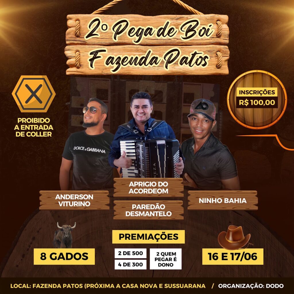 Entre os dias 16 e 17 de junho haverá um evento maravilhoso chamado Segunda Pega de Boi, o mesmo acontecerá na Fazenda Patos próximo à Casa Nova e Sussuarana.