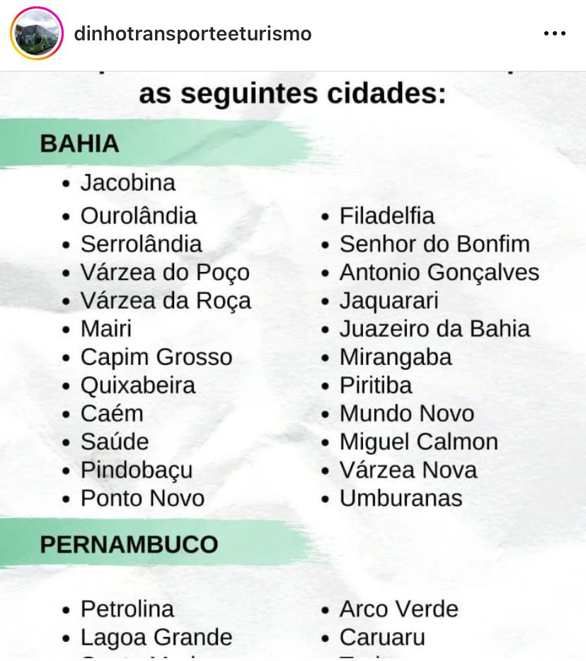 Com a Dinho Turismo você pode viajar para diversos lugares e a rota cobre diversas cidades na Bahia e em Pernambuco.
